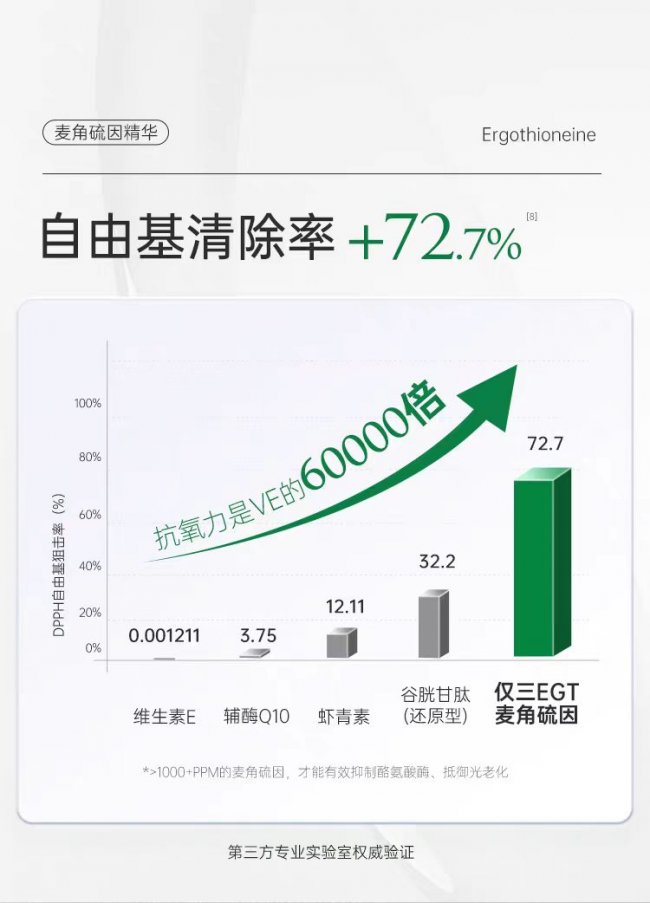 基于麦角硫因本身的分子特性,玻麦研产品的抗氧化能力经第三方检测证实:清除DPPH自由基能力是维生素E的60000倍,是辅酶Q10的20倍,是虾青素的6倍,是谷胱甘肽的2倍,可在皮肤表面形成长达12小时的抗氧化防护层,有效抵御紫外线、空气污染等外界因素造成的氧化损伤。