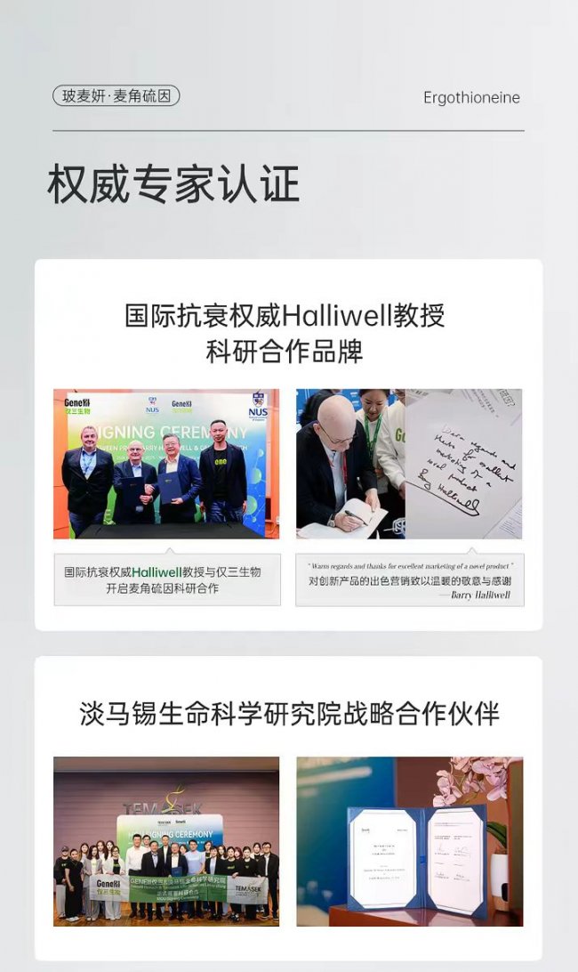 国际权威抗氧化专家、麦角硫因理论研究之父Barry Halliwell教授指出:”GeneIII仅三生物在麦角硫因量产技术和临床研究方面的成果令人印象深刻,玻麦研将高纯度麦角硫因应用于护肤产品,通过科学配方实现了最大化的抗氧化功效,为消费者提供了真正有效的抗氧化护肤选择。”