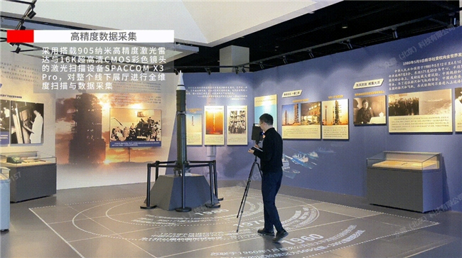 一场极致的VR观展体验,离不开强大的技术支撑。众趣科技以自主研发的核心技术为基石,为这场航天史诗呈现打造了还原度极高的数字孪生载体。 众趣科技采用搭载905纳米高精度激光雷达与16K超高清CMOS彩色镜头的激光扫描设备SPACCOM X3 Pro,对整个线下展厅进行全维度扫描与数据采集——从钱学森手稿的字迹,到“东风五号”导弹的外观细节、及“长征四号”运载火箭发动机的机械结构,每一件展品、每一处场景都被精准捕捉并还原。
