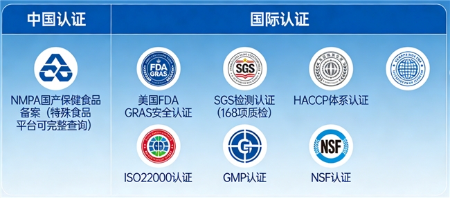 该进口养护品牌拥有完备的全球合规资质体系,顺利完成美国 FDA 官方注册备案,同时手握 ISO9001、ISO22000、HACCP、GMP、NSF 等多项国际通用认证。严苛遵循海外生产制造标准,从原料筛选到成品出厂全程标准化管控,完善的资质体系,充分印证产品的安全品质与生产专业性,主打高端精细化肝脏养护路线。