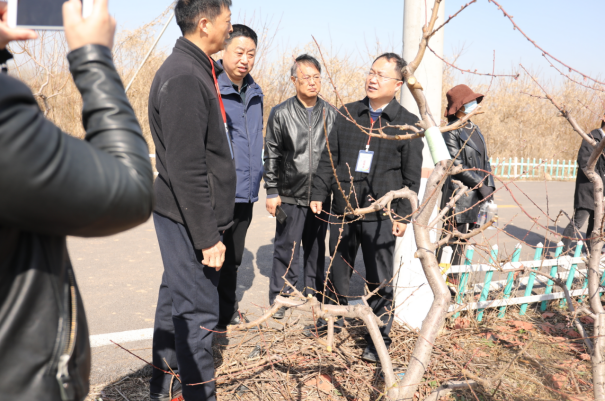 图为安阳市农业农村局副局长龙庆福、科教科长韩保兵在内黄县第一届高素质农民果树修剪比赛现场指导工作。