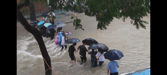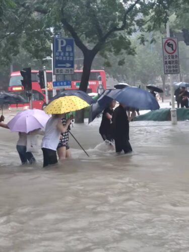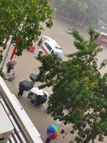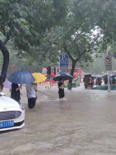 7月20日,河南郑州遭遇罕见持续强降雨过程,市区出现严重内涝。持续强降雨下的绿城郑州,顷刻间大街小巷变成了一片汪洋,由于地势较低的缘故,花园路、红专路水流湍急,着急回家的人们只能望“河”兴叹,试图淌水而过,但膝盖以上部位的水流冲击力之大让人难以在水中站稳,稍不注意就会被水流冲倒、冲走……情况十分危急。