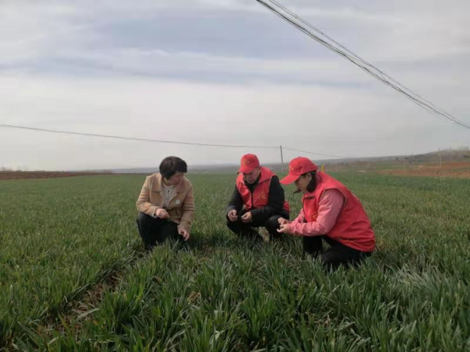 梁晶(右一)在给农户指导小麦田病虫害防治技术。(资料图片)