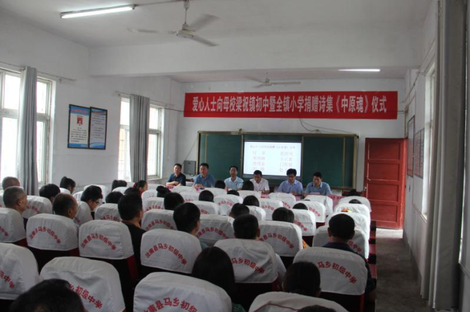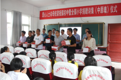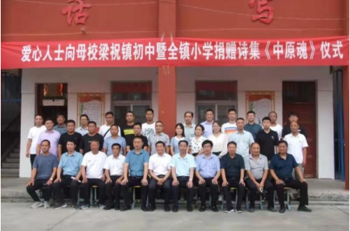 7月23日,河南省汝南县梁祝镇初级中学多功能厅里欢声笑语,掌声不断,爱心人士向母校梁祝镇初中及全镇小学捐赠诗集《中原魂》仪式在这里举行。