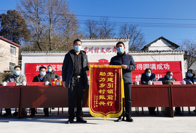东川村党支部书记张成林(左)向卢氏县邮政公司总经理赵清瑞(右)赠送锦旗